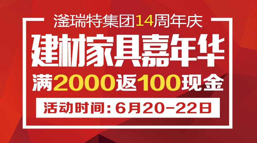 滏瑞特齊家網(wǎng)建材館、家居生活體驗(yàn)館同賀集團(tuán)14周年慶,6月20至22日建材家具嘉年華,滿2000元返100元現(xiàn)金,云集大品牌,齊放最低價(jià)。限時(shí)搶購(gòu),瘋狂砍價(jià),整點(diǎn)秒殺。