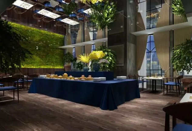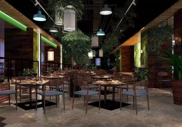 現(xiàn)代主題餐廳效果圖中,滲入了許多時(shí)尚元素,在考慮到現(xiàn)代人喜愛(ài)簡(jiǎn)潔這一要點(diǎn),餐廳的布局更顯簡(jiǎn)潔。這時(shí)一家以極進(jìn)自然的餐廳,墻面用綠色藤蔓做裝飾,吊頂也掛上樹枝裝飾,悠閑且浪漫。