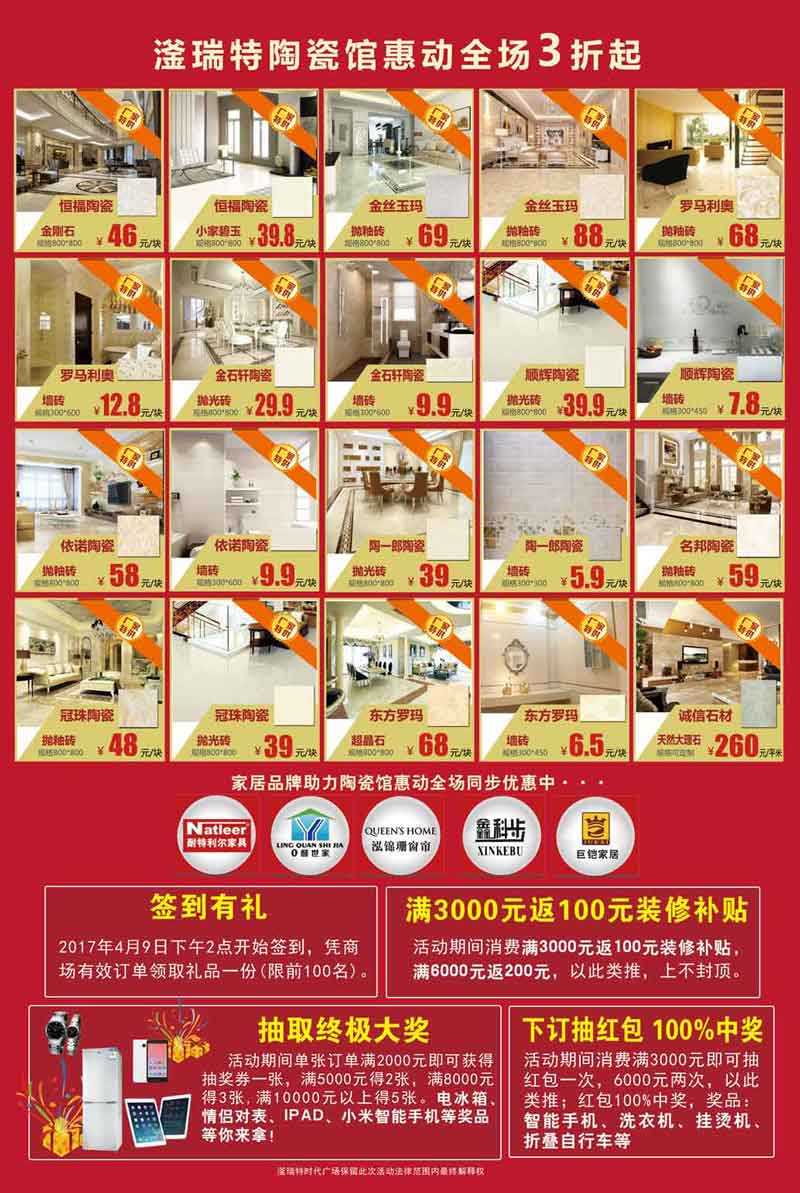 惠裝修就來滏瑞特建材館,全場特惠,廠價直供,2017年3月15日至4月15日活動期間凡單店消費滿800元以上贈精品湯鍋一個,消費滿2000元以上贈電烤箱一臺,消費滿5000元以上贈電飯煲一個,消費滿8000元以上贈微波爐一個,消費滿10000元以上贈紅米智能手機一部?;顒悠陂g更有聯(lián)單獎,2-3單贈鍋具三件套,4-5單贈電烤箱,6-7單贈電壓力鍋,8單以上贈全自動洗衣機。4月15日九點到九點半集中爆破用戶簽到,預售品兌換,抽取終極大獎。